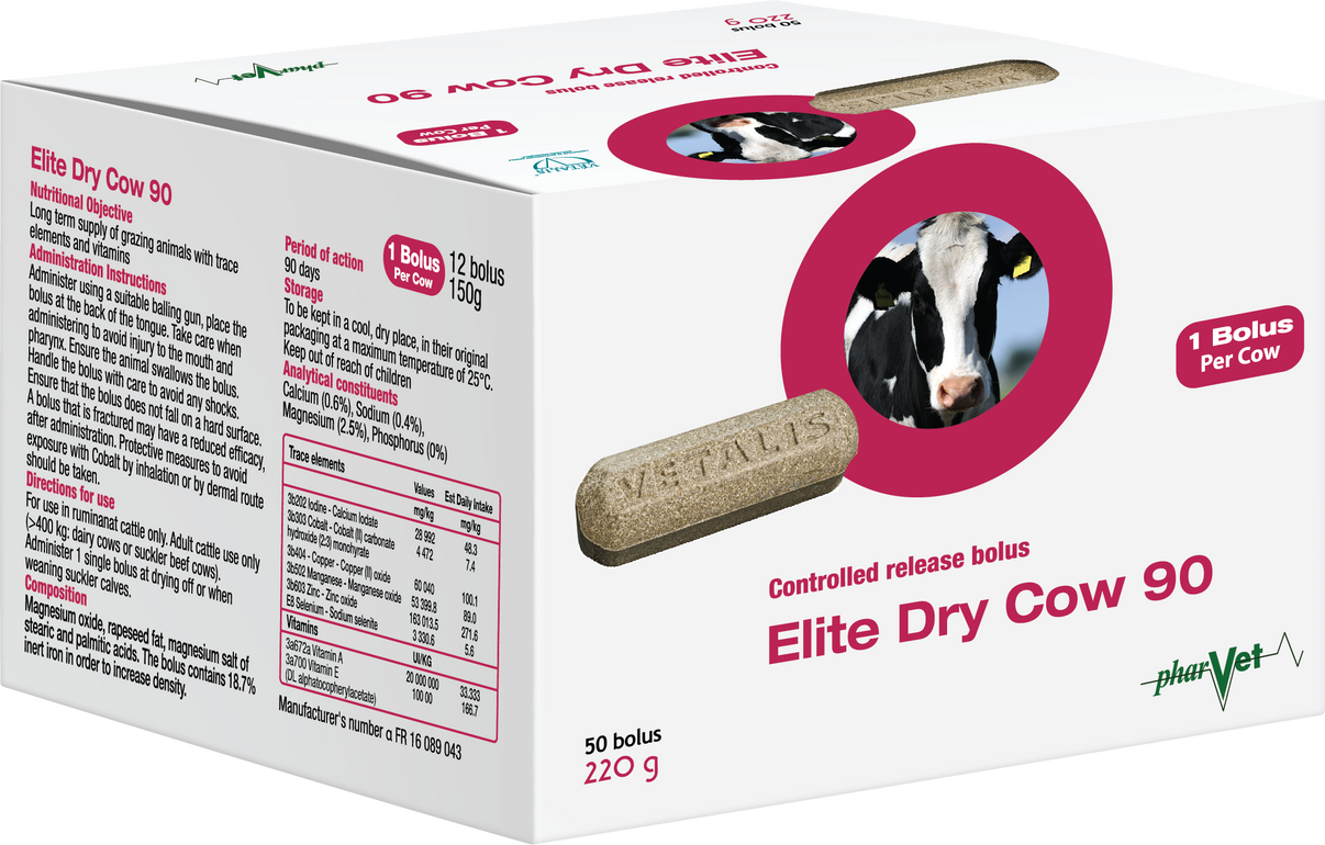Long acting bolus that provides a balanced and controlled supply of essential trace elements required during the dry period. It provides cobalt, copper,manganese, iodine, zinc, selenium, vitamin E and vitamin A.