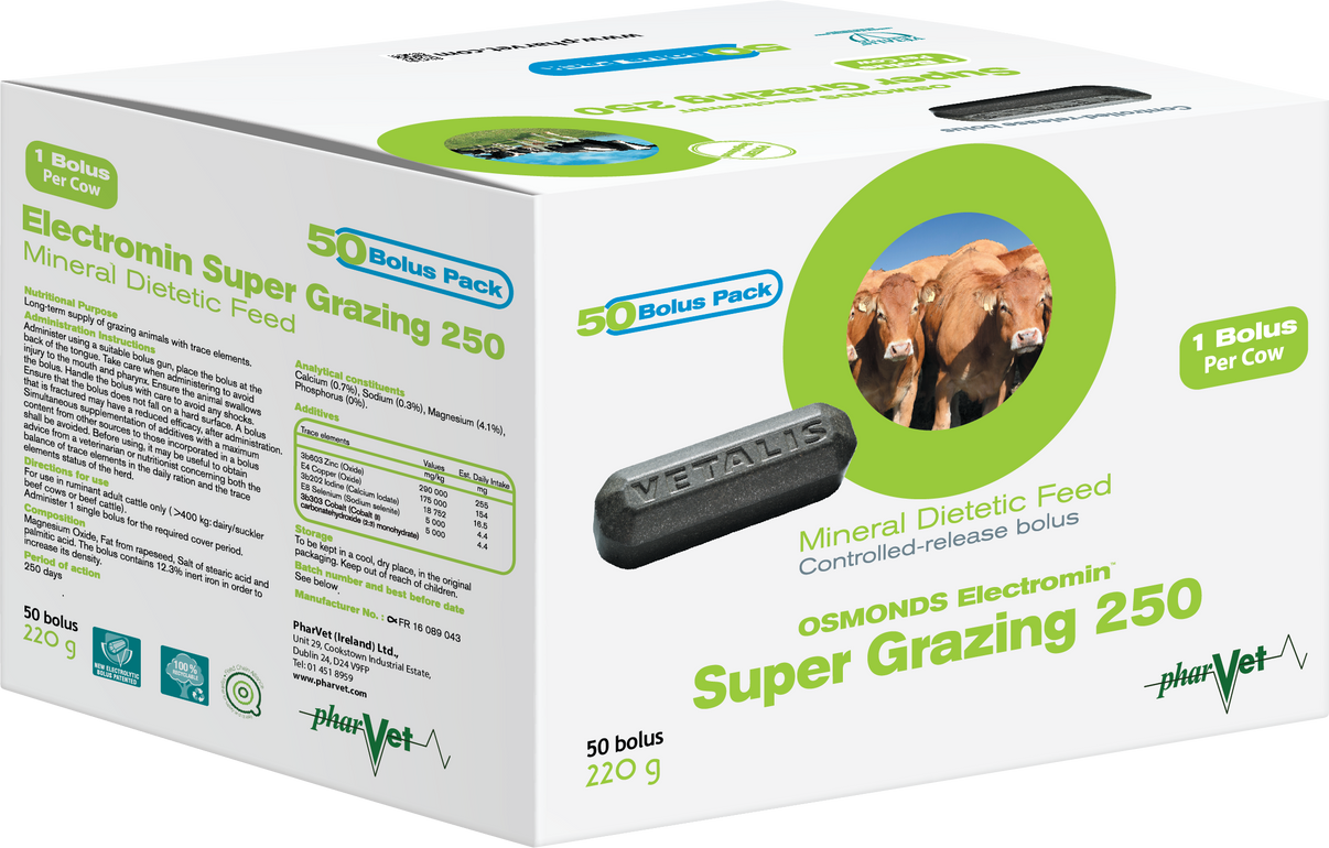 Unique, long acting and highly concentrated bolus that provides a balanced and concentrated supply of essential trace elements for the entire grazing season (250 days). It provides